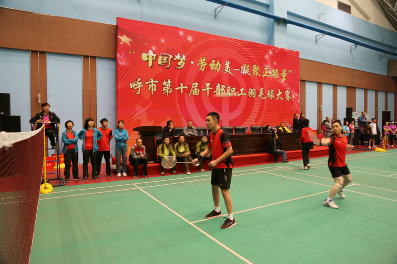由呼市总工会、呼市体育局联合举办的“中国梦 劳动美---凝聚正能量”呼市第十届干部职工羽毛球大赛于10月12日下午在市乒乓训练中心胜利闭幕 !全市51个机关单位的500余名干部职工参加了比赛。本次比赛倡导“我运动、我健康、我快乐”的健身理念,是对我市文化建设和精神文明建设的一次检阅。市委常委、呼和浩特警备区司令潘平,市人大常委会副主任、市总工会主席斯钦毕力格,市委宣传部副部长赵前宽,市体育局局长史荣恩、调研员马维,呼和浩特警备区常委、后勤部长葛明,市纪委调研员黎明,市直机关党工委副书记孙立芳,市总工会党组书记、副主席李欣莉等领导出席了开幕式并观看了比赛。