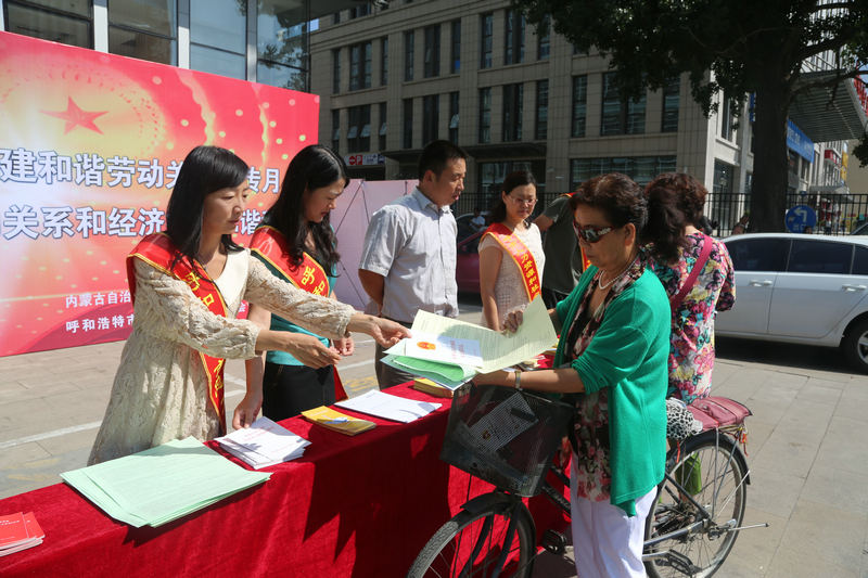为全面贯彻中共中央、国务院《关于构建和谐劳动关系的意见》,深入推进和谐劳动关系单位创建活动,8月27日,呼市总工会、人力资源和社会保障局、工商联在奈伦大厦前开展集中宣传活动。