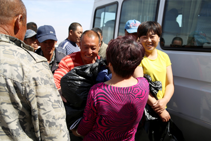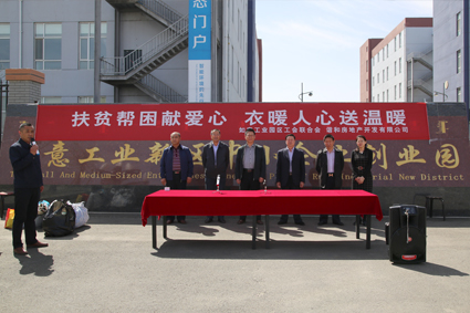 4月27日上午,如意工业新区指挥部主任武成祥同志,如意工业园区工会联合会副主席白文晔同志,如意开发区谐和房地产开发有限公司董事长王晓林同志,共同将募集到的衣物赠予沙尔沁村村民。