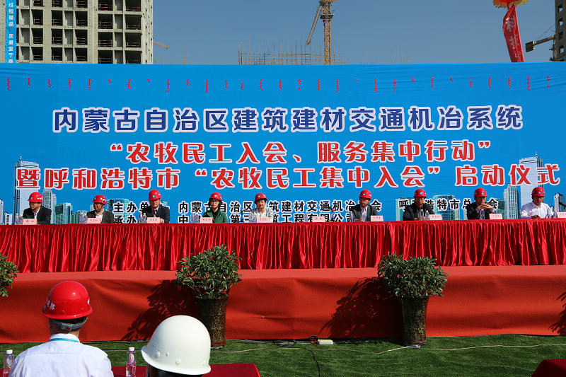 由内蒙古自治区建筑建材交通机冶工会,呼和浩特市总工会主办,中建二局第三建筑工程有限公司承办,“内蒙古自治区建筑建材交通机冶系统农牧民工入会、服务集中行动”暨“呼和浩特市农牧民工集中入会”启动仪式于5月10日上午在呼和浩特市回民区万达广场隆重举行。来自施工现场的200多名农民工代表参加了入会行动,自治区总工会副主席王丽红、市总工会副主席张瑞新及中建二局三公司相关领导参加了会议,会议由区总建筑建材交通机冶工会主席陈威主持。