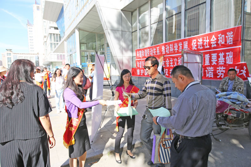 为全面贯彻中共中央国务院《关于构建和谐劳动关系的意见》(中发[2015]10号),深入推进和谐劳动关系单位创建活动,进一步增强职工的法律意识,提高职工知法、学法、守法、用法的自觉性,呼和浩特市劳动关系三方委员会在全市开展构建和谐劳动关系宣传月活动。9月1日,呼和浩特市总工会、人力资源和社会保障局、呼和浩特市工商联在奈伦大厦前进行集中宣传活动。