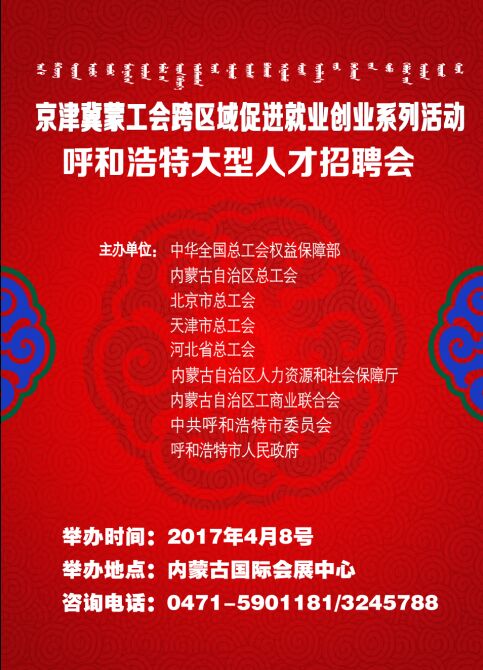 由自治区总工会会同北京、天津、河北三省(市) 工会,联合自治区人社厅、自治区工商联和呼和浩特市委、市人民政府共同主办,市总工会、人社局、工商联、团市委、妇联联合承办的“2017 年京津冀蒙工会跨区域促进就业创业系列活动暨呼和浩特大型招聘会”将于4月8日至9日在内蒙古国际会展中心举办。