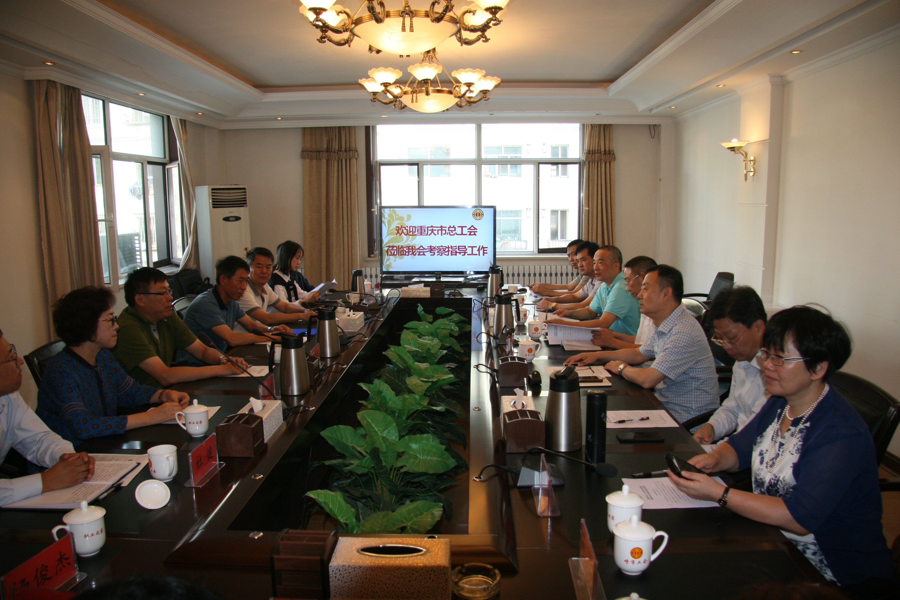 9月20日,重庆市总工会副巡视员李宏带队一行15余人, 来我会进行考察指导,自治区总工会财务部部长赵雁滨、财务部调研员高爱富陪同,市总工会副主席张瑞新、财务部部长杜健一同参加了活动。双方就工会经费地税代征及财务管理工作进行座谈交流。