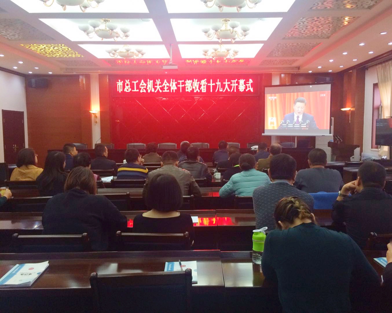 10月18日上午9时整,中国共产党第十九次全国代表大会在北京人民大会堂隆重召开,市总工会领导班子及机关和直属单位全体党员干部集中收看了党的十九大开幕式, 全程倾听习近平总书记所作的报告。