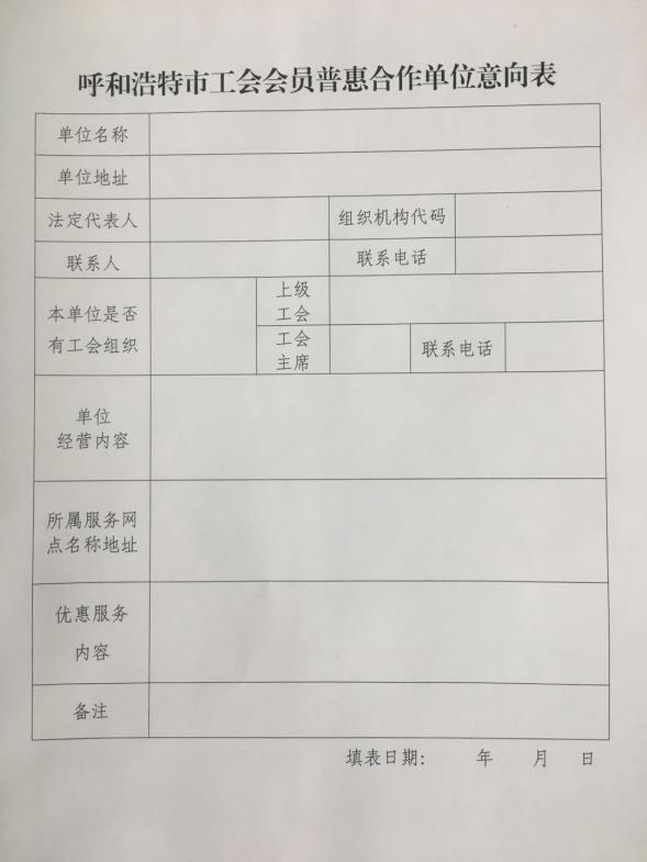 有意向的企业或服务单位可就近联系所属地区、产业工会也可直接与市总工会基层部对接洽谈,并填写《呼和浩特市工会会员普惠合作单位意向表》,经市总工会审核筛选后,对于符合合作条件的商家签署合作协议。