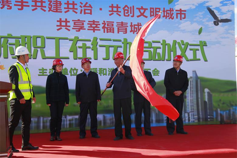 4月10日,呼和浩特市总工会“携手共建共治、共创文明城市、共享幸福青城——首府职工在行动”启动仪式在中建三局呼和浩特城市道路改造提升工程哲里木路工地正式启动。