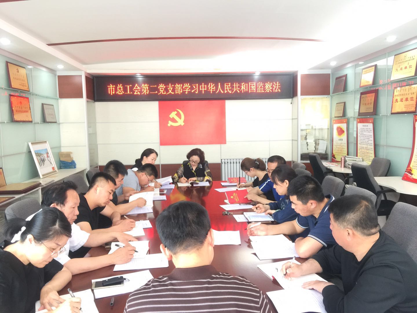 4月28日下午,市总工会第二党支部召开理论学习会,集中学习了《中华人民共和国监察法》,二支部全体党员、入党积极分子、市总工会党组成员、副主席张瑞新参加了此次学习。
