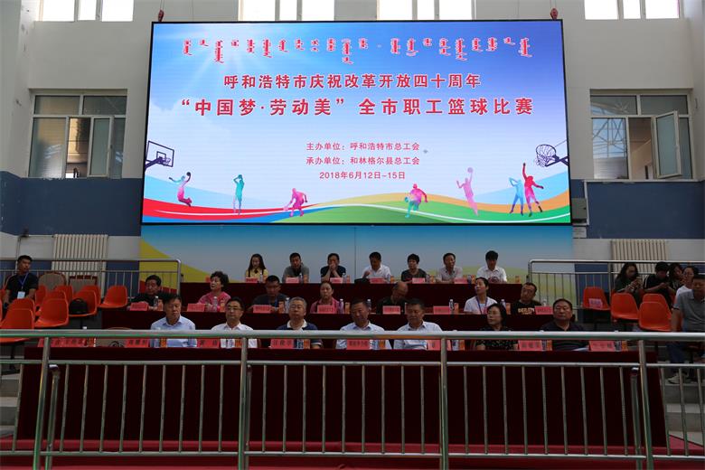 为庆祝改革开放四十周年,深入贯彻党的十九大精神,大力发展职工体育事业,进一步丰富职工的业余生活。 6月12日,由呼和浩特市总工会主办,和林格尔县总工会承办的庆祝改革开放四十周年“中国梦·劳动美”全市职工篮球比赛在和林格尔县隆重开幕。呼和浩特市人大副主任,总工会主席斯钦毕力格出席开幕仪式,市总工会党组书记、副主席汪俊亭致开幕词,并宣读比赛开幕。来自全市各企事业单位的29支篮球队,400余人参赛,赛期预计4天。