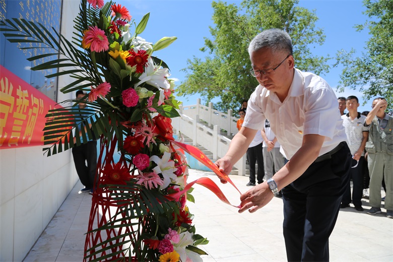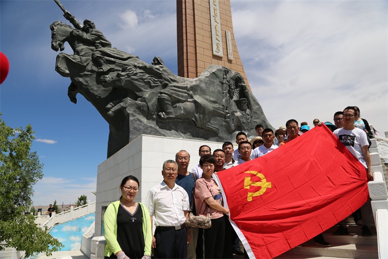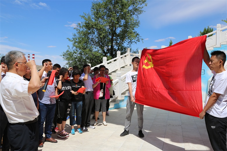 活动中,全体党员干部首先向百灵庙抗日武装暴动革命烈士敬献了花篮,瞻仰了纪念碑。并在鲜红的党旗下,由市总工会党组书记、副主席汪俊亭带领下重温了入党誓词。
