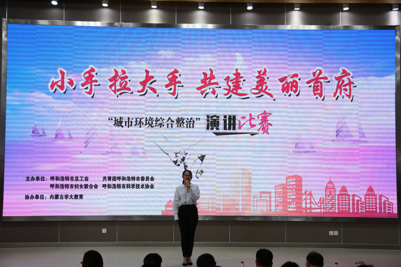 为了全面贯彻落实市委市政府关于城市环境综合整治行动的安排部署,激发广大干部群众参与城市环境综合整治工作中的热情和干劲,充分发挥群团组织优势和先锋模范作用,由市总工会、团市委、市妇联、市科协联合主办的“小手拉大手 共建美丽首府”主题演讲比赛决赛于7月20日下午在呼和浩特市北京四中分校隆重举办。