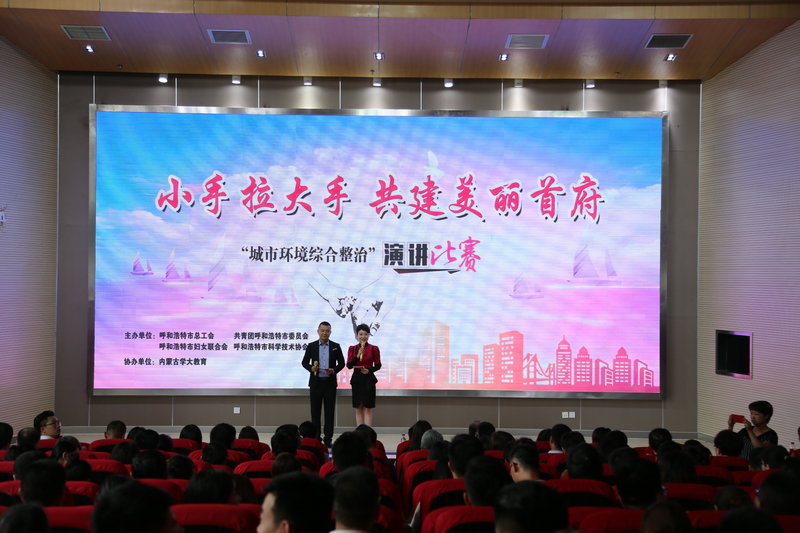 为了全面贯彻落实市委市政府关于城市环境综合整治行动的安排部署,激发广大干部群众参与城市环境综合整治工作中的热情和干劲,充分发挥群团组织优势和先锋模范作用,由市总工会、团市委、市妇联、市科协联合主办的“小手拉大手 共建美丽首府”主题演讲比赛决赛于7月20日下午在呼和浩特市北京四中分校隆重举办。