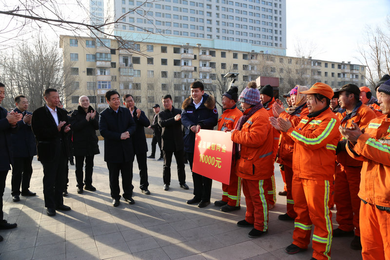 1月28日上午,呼和浩特市市委常委、常务副市长刘文玉,市人大常委会副主任、市总工会主席斯钦毕力格,市政协副主席孙清宾,代表市四大班子和市总工会,来到玉泉区慰问春节期间坚守岗位的环卫工人。随后对五户生活困难的市民进行了家访,为他们送上了节日慰问金和慰问品,将党和政府的温暖送到了他们手中。