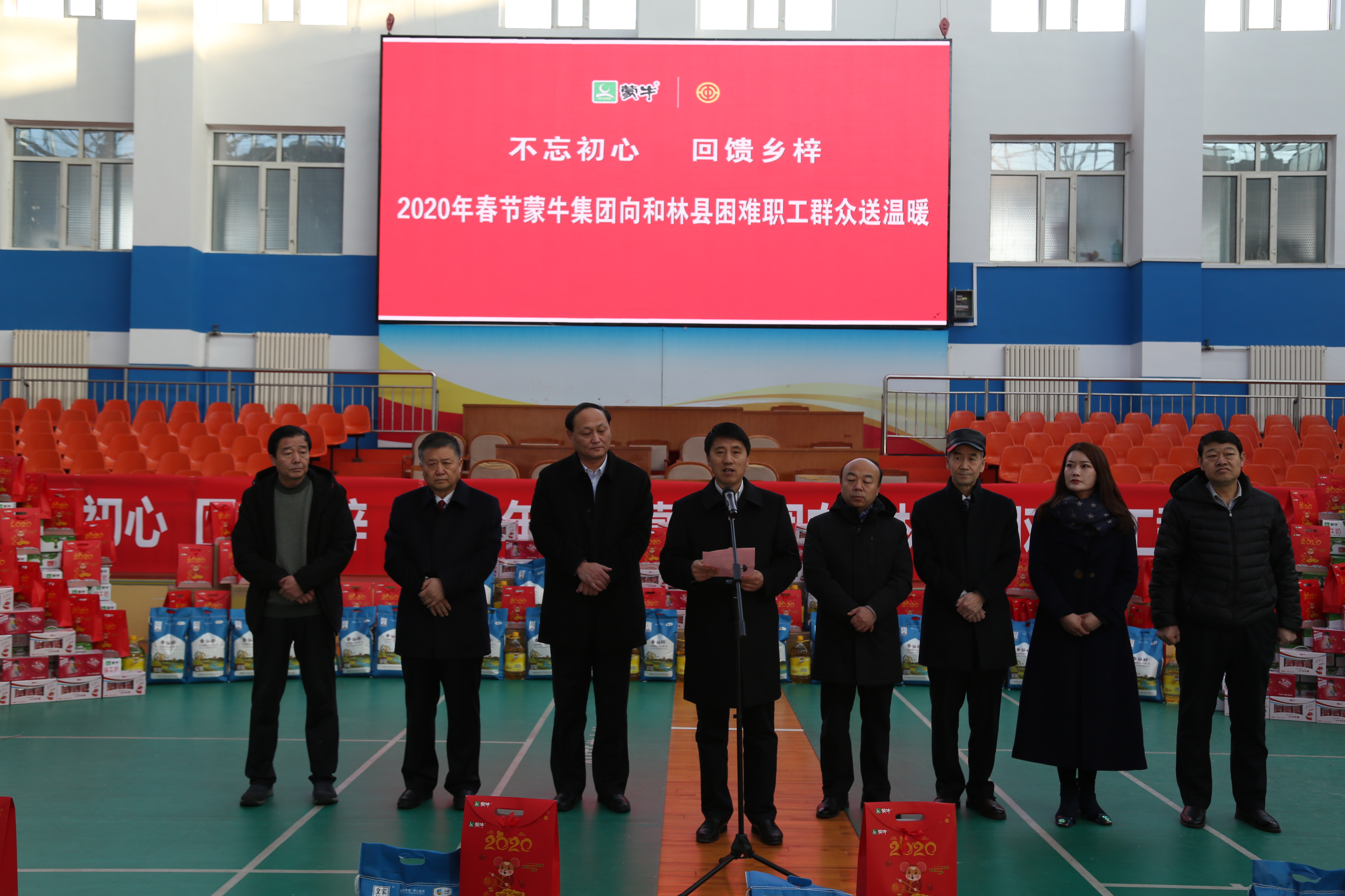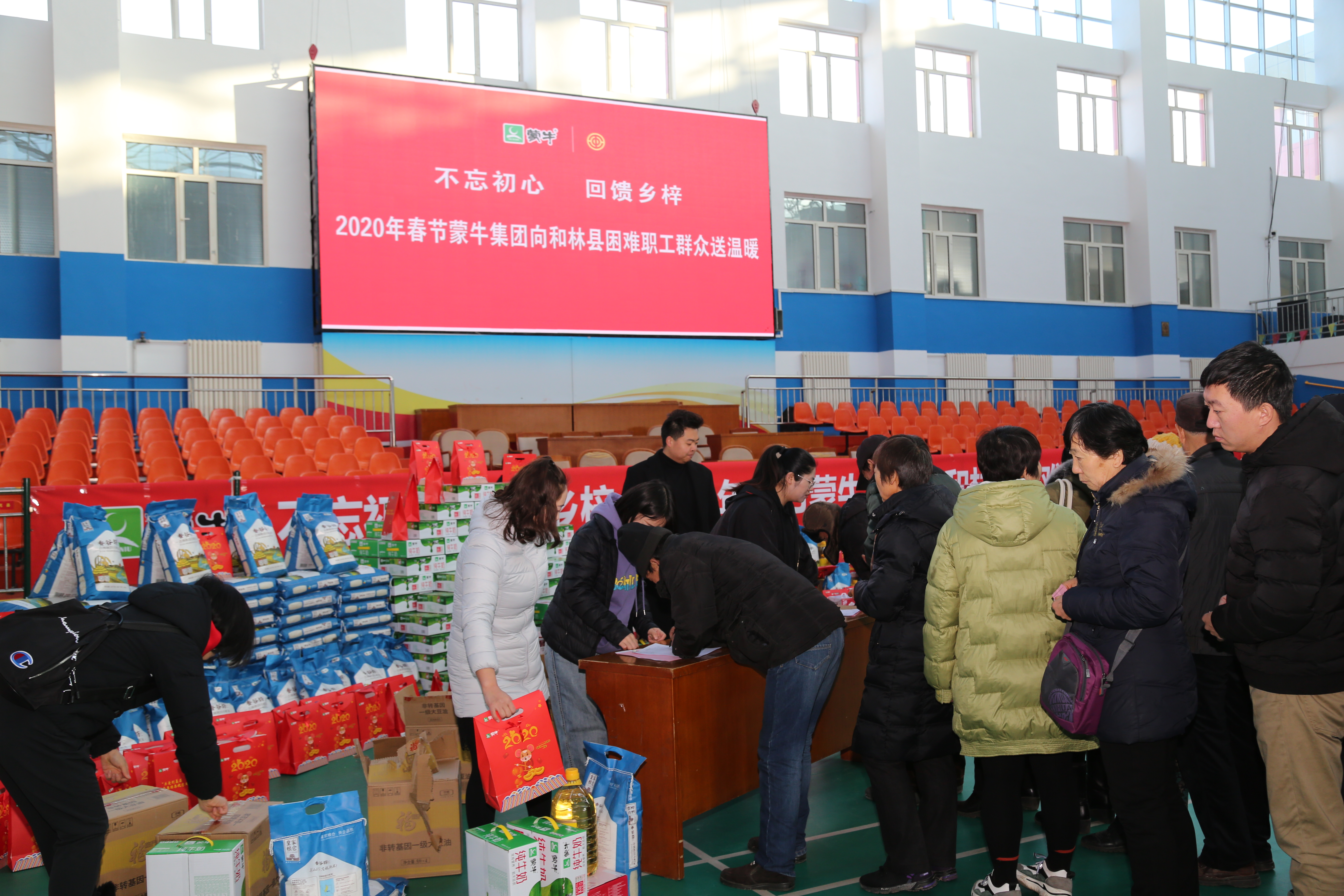 不忘初心、回馈乡梓,1月14日,“2020年春节蒙牛集团向和林格尔县困难职工群众送温暖”慰问活动在和林县职工活动中心举行,县委、县政府领导和县工会领导等人参加了慰问仪式。
