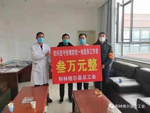2月6日上午,和林格尔县总工会党组书记、主席王建功,副主席云平文一行带着慰问金到县人民医院亲切慰问奋战在抗疫一线的医务工作者。和林县总工会投入8.34万元用于全县重点单位的抗疫保障工作。
