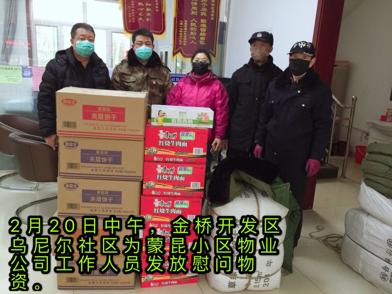 疾病无情,人间有爱。2月20日,金桥开发区乌尼尔社区党支部书记贾瑞与蒙昆小区临时党支部书记李宇升,为默默坚守在疫情防控一线的蒙昆小区物业公司工作人员送上慰问品。并对他们在疫情防控中所做的工作给予了高度的肯定,对他们毫无怨言的辛劳付出表示了诚挚的感谢,最后叮嘱他们工作的时候要注意安全、做好自我防护。