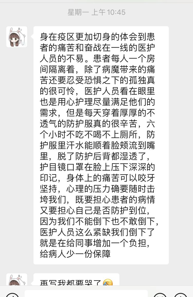 2月10日上午十点四十五分,援鄂护士党员冯洋,身在疫区更加切身的体会到患者的痛苦和奋战在一线医护人员的不易。患者每人一个房间隔离着,除了病魔带来的痛苦还要忍受恐惧之下的孤独,真的很可怜,医护人员看在眼里,也是用心护理,尽量满足他们的需求。但每天穿着厚厚的不透气的防护服真的很辛苦,6个小时不吃不喝不上厕所,防护服里全是汗水,顺着脸颊流到嘴里,脱了防护服,后背全湿透了。护目镜口罩在脸上压下深深的印记,身体上的痛苦可以咬牙坚持,心理上的压力却要随时击垮我们,既担心患者的病情又担心自己是否防护到位,因为我们不能倒下也不敢倒下,医护人员这么紧缺,我们倒下了,就是在给同事增加负担,给病人就会少一份保障。