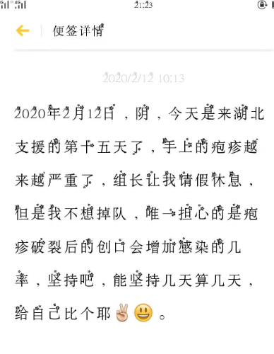 2月12日上午十点十三分,阴,今天是来湖北支援的第十五天了,手上的疱疹越来越严重了,组长让我休息,但是我不想掉队,唯一担心的是疱疹破裂后的创口会增加感染的几率,坚持吧,能坚持几天算几天,给自己比个耶。