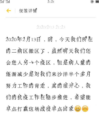 2月13日晚上二十一点二十三分,阴,今天我们所在的二病区撤区了,虽然明天我们还会进入另一个疫区,但是病人量的逐渐减少是对我们来沙洋半个多月努力工作的肯定,真的很开心,我们的疫区工作在稳步推进,希望能早点打赢这场战役,早点回家。