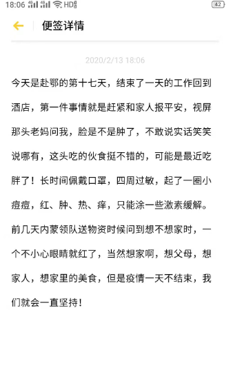 2月13日下午十八点零九分,援鄂护士乔薇在她的便签日记里写道,今天是赴鄂的十七天,结束了一天的工作回到酒店,第一件事就是赶紧和家人报平安,视频那头老妈问我,脸是不是肿了,不敢说实话,笑笑说哪有,这头吃的伙食挺不错的,可能是最近吃胖了。长时间佩戴口罩,四周过敏,起了一圈小痘痘,红、肿、热、痒,只能涂一些激素缓解。前几天内蒙领队送物资时候问到想不想家时,一个不小心眼睛就红了,当然想家啊,想父母,想家人,想家里的美食,但是疫情一天不结束,我们就会一直坚持。