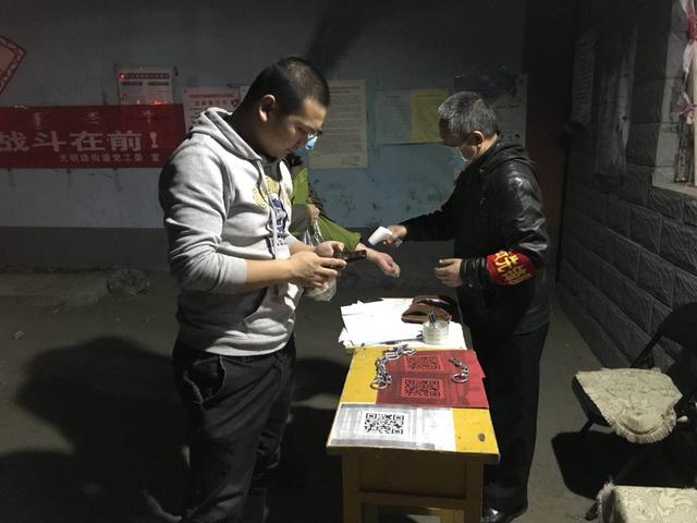 “您是本小区居民吗?请扫码登记”天已经黑了,在呼和浩特西铁小区监测点上,回民区总工会干部乔俊仍然坚守在自己的岗位上,督促居民扫码出入,为出入小区的居民测量体温。