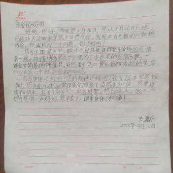在社区疫情防控面前,她只有一个身份,就是冲在疫情战场最前线的守护者,而脱下“战袍”她也是女儿,是妻子,是妈妈。说起年幼的儿子,她始终内心有些许愧疚。“平时工作忙,儿子早就盼着我过年休息陪陪他们,非常时期,我已经快一个月没见过孩子了。”懂事的儿子在家自学疫情防护知识,做了3张疫情手抄报,他用他的文字和画笔为武汉加油,为大家加油!看到儿子写的那封思念妈妈的一封信。她潸然落泪,几度哽咽,她擦了擦眼泪,抽空给孩子打了一个电话。她笑容满面在电话里夸赞儿子的手抄报,也对孩子说了她和孩子爸爸对他的思念。她在忍受着思念儿子的泪水,儿子高兴地对她说:“妈妈,妈妈,我终于看到您了,虽然是在电视新闻里。妈妈其实我特别想看看您的脸,我知道这个小小的愿望一定很快就会实现。”儿子的可爱懂事,使她暖进了心田,夜晚的时候,她把儿子的这段话,用微信告诉了丈夫,也希望丈夫在不忙的时候,打开手机看看儿子的话语,能让他疲惫的身心有些许的放松。