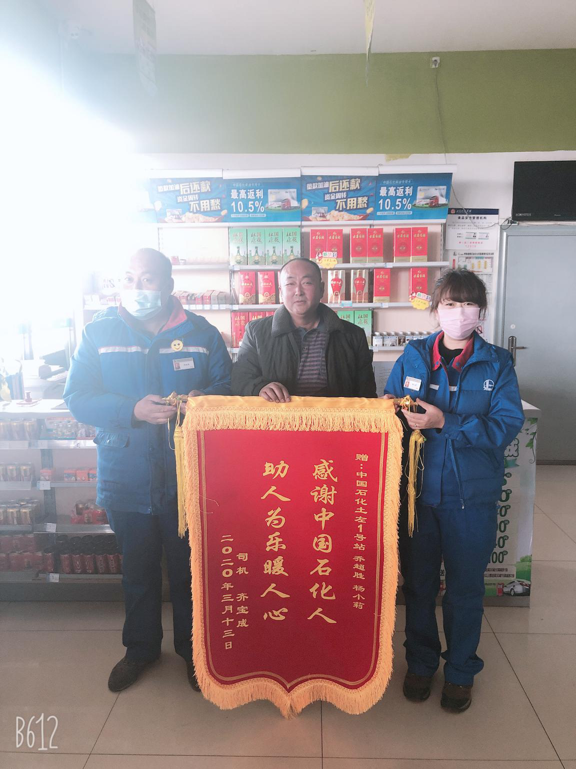 3月18日,一名司机师傅捧着写有“感谢中国石化人 助人为乐暖人心”的锦旗走进中国石化内蒙古呼和浩特石油分公司土一加油站,向曾帮助他走出困境的石化人表示感谢!