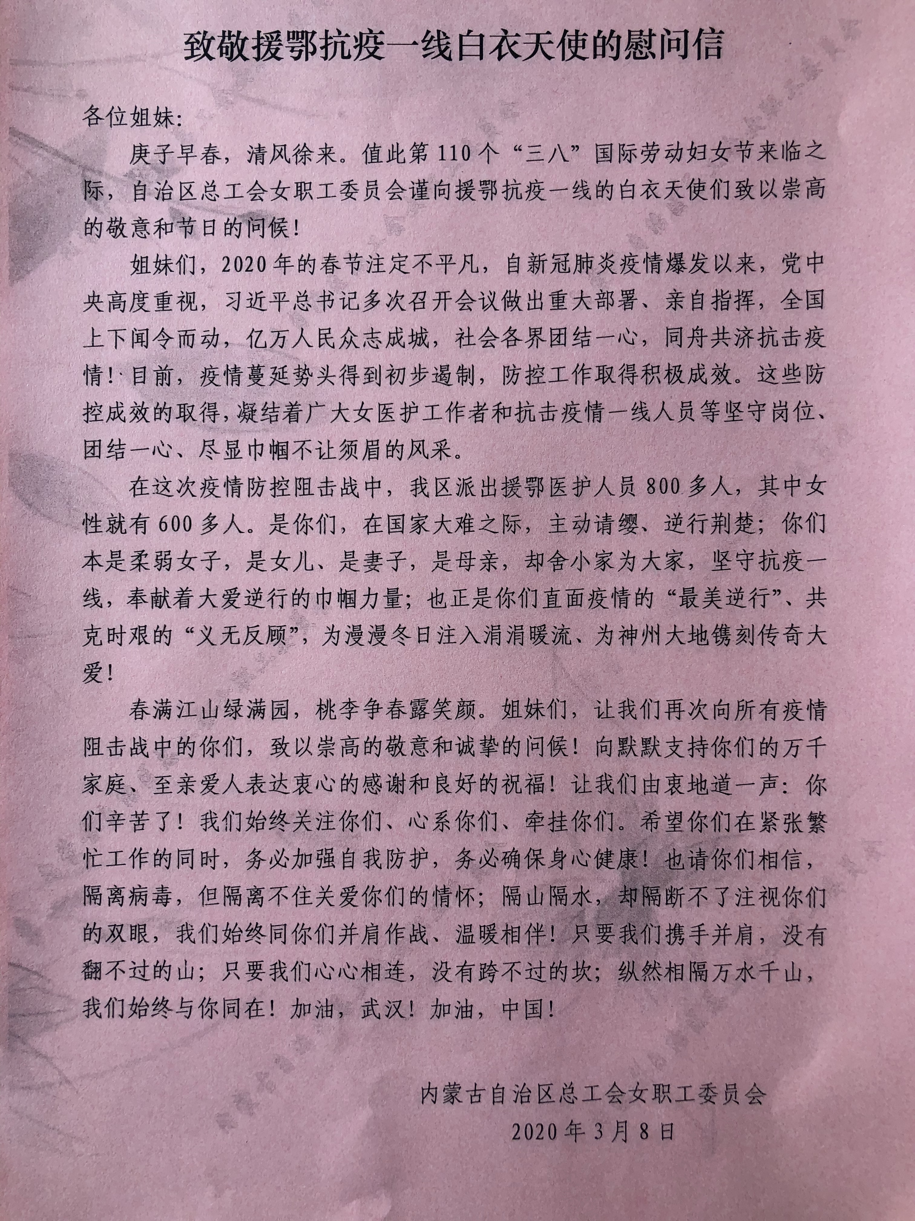 疫情期间,工会高度重视对医护人员的关爱与关怀。我区派出的医务人员和疾控人员共847名,其中有600余名女性医务工作者。为此,自治区总工会女职工委员会为白衣“逆行巾帼英雄”准备了特殊的礼物——一封“致敬援鄂抗疫一线白衣天使的慰问信”和一份一年期女性“两癌”特病保险。这是一项为女职工服务的公益性和福利性保险,为我区的“逆行者”们送去了一份保障。随着战疫形式持续向好,完成救助任务的内蒙古驰援湖北的医护人员开始分批撤离返回家乡。呼市总工会也将这份特殊的礼物送到了每位医护人员的手中,这无疑是涌向一线医务人员内心深处的一股暖流,也表达了工会“娘家人”的全力支持和真情温暖。