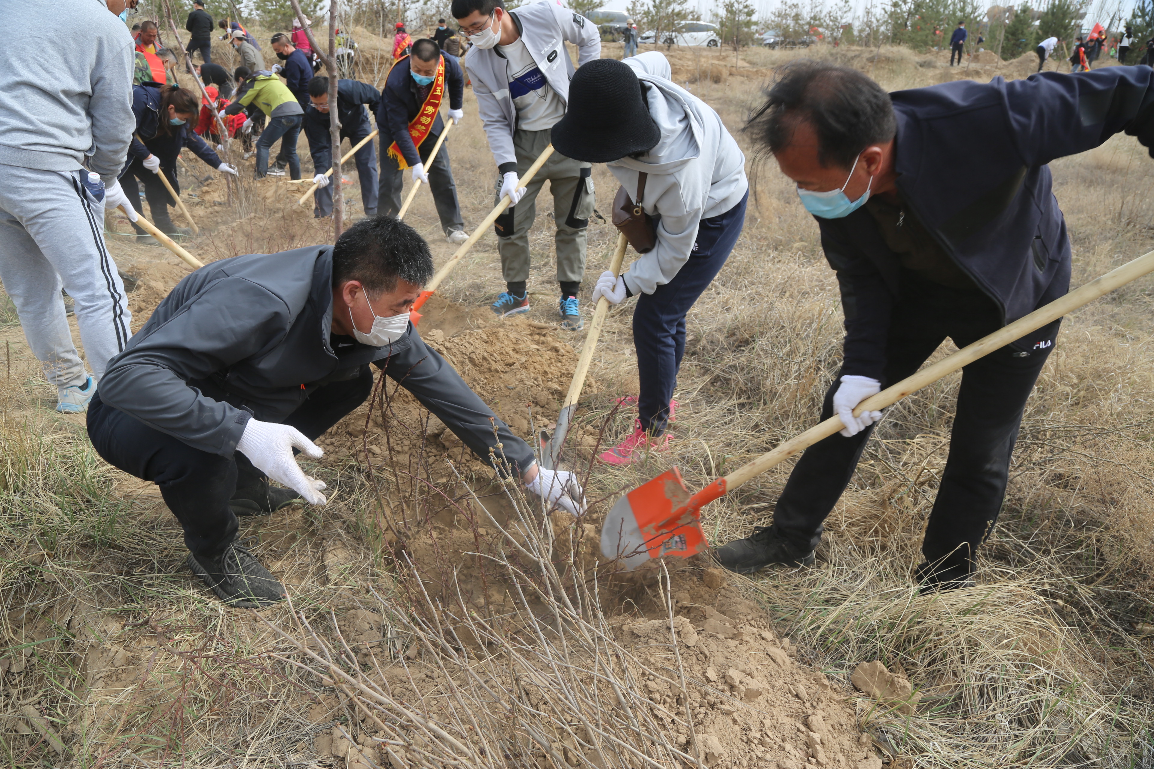 活动现场,内蒙古、呼市两级劳模与市总工会机关工作人员一道,几人一组,配合默契,扶正苗木、挥锨铲土、脚踏压实、堆起围堰,提水浇灌……道道工序做的认真细致,共种下1500棵(株)松树,果树,山桃等。