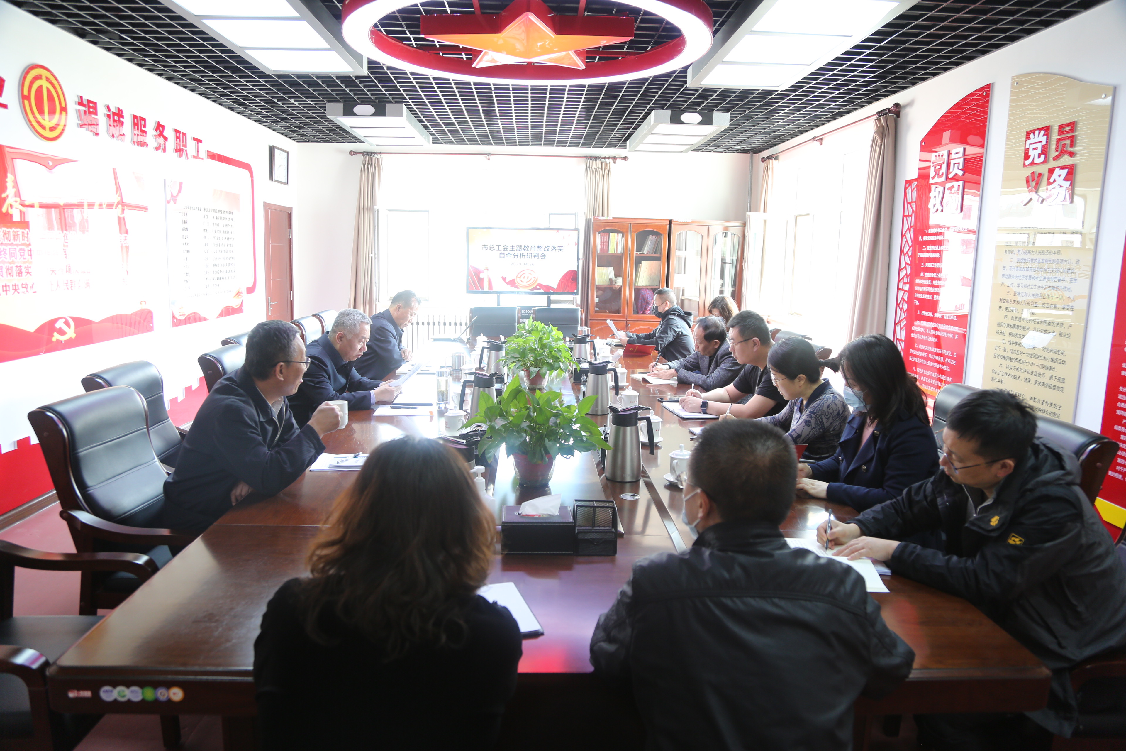 根据市委关于主题教育整改落实情况进行“回头看”的安排部署,2020年4月26日下午,市总工会召开党组会议,对市总工会主题教育整改落实自查情况进行分析研判。党组书记汪俊亭主持会议并讲话。市总工会党组成员冀罕钢、任增刚出席会议,机关有关部室负责同志列席会议。