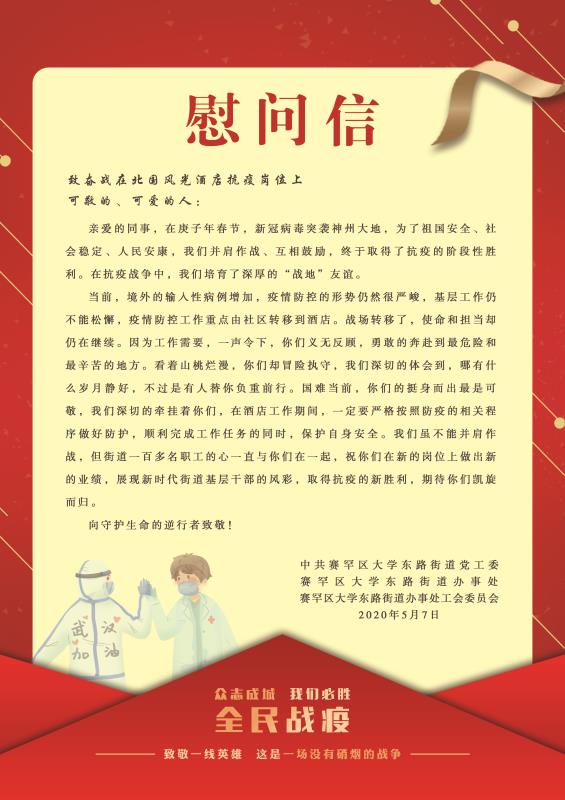5月7日下午,呼和浩特市大学东路街道办事处领导班子全体成员和工会工作人员去北国风光酒店慰问驻酒店集中隔离医学观察点职工,并送去慰问信和慰问品,对他们的辛苦工作给予了肯定。