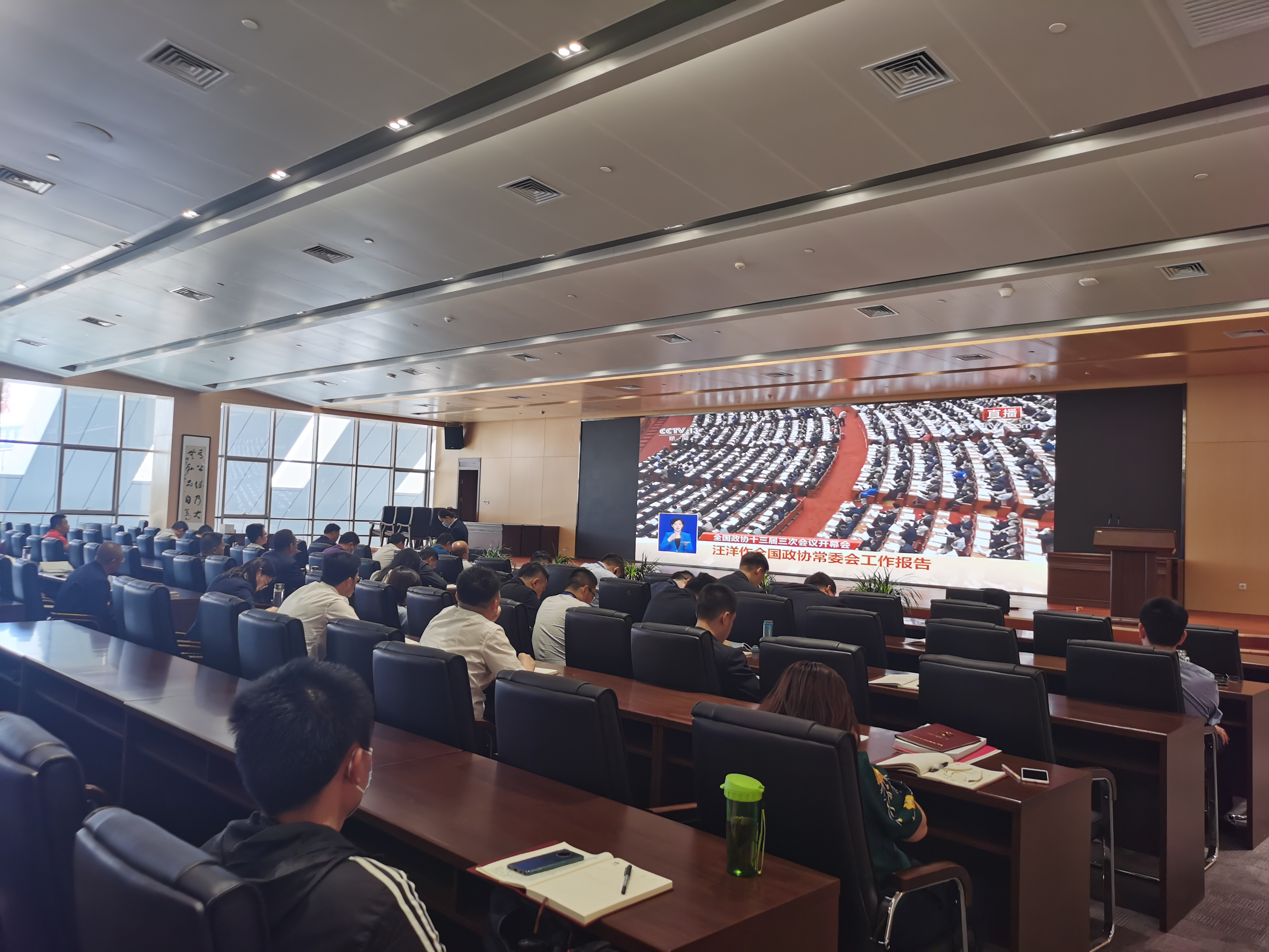 地铁控制中心报告厅内,公司领导班子、各基层党组织书记和全体中层以上干部认真听取学习中国人民政治协商会议全国委员会常务委员会工作报告和全国政协十三届二次会议以来提案工作情况报告,做到以身作则、带头参加、做好表率。