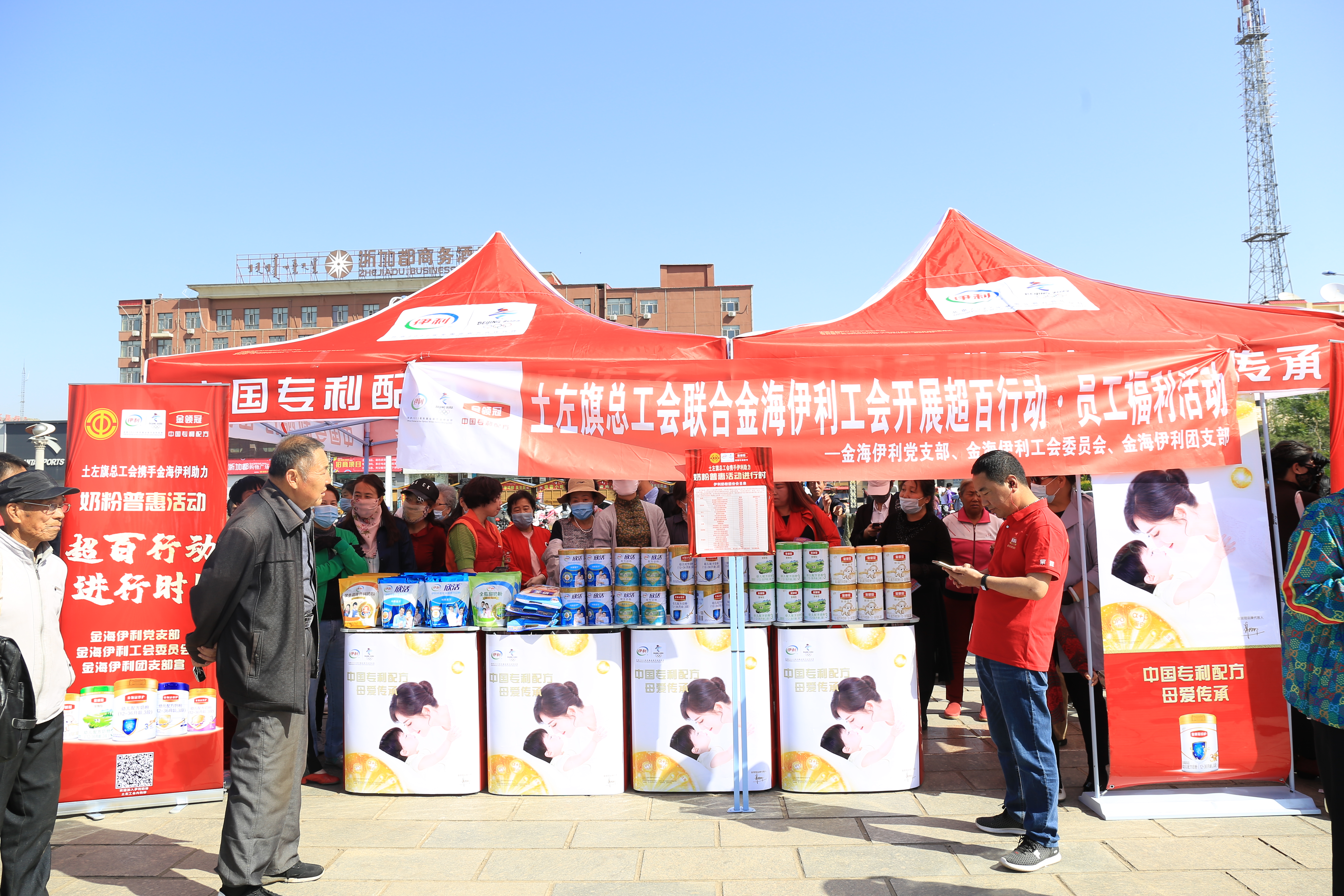 旗总工会特联合金海伊利工会在察素齐镇原政府广场开展了伊利品牌各类奶制品集中售卖活动1
