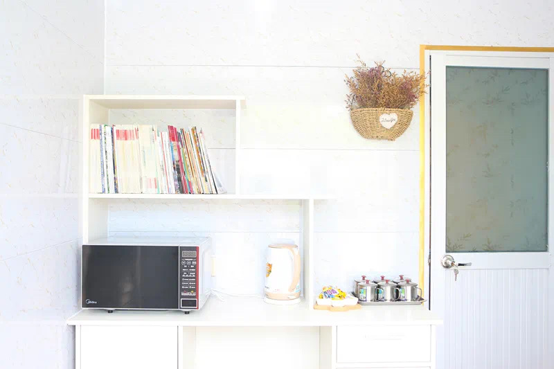 金山热电工会爱心驿站配备休息室和卫生间,休息室配有电热水壶、水杯、微波炉、雨伞、桌椅、电热器散热板、书籍等基础物品