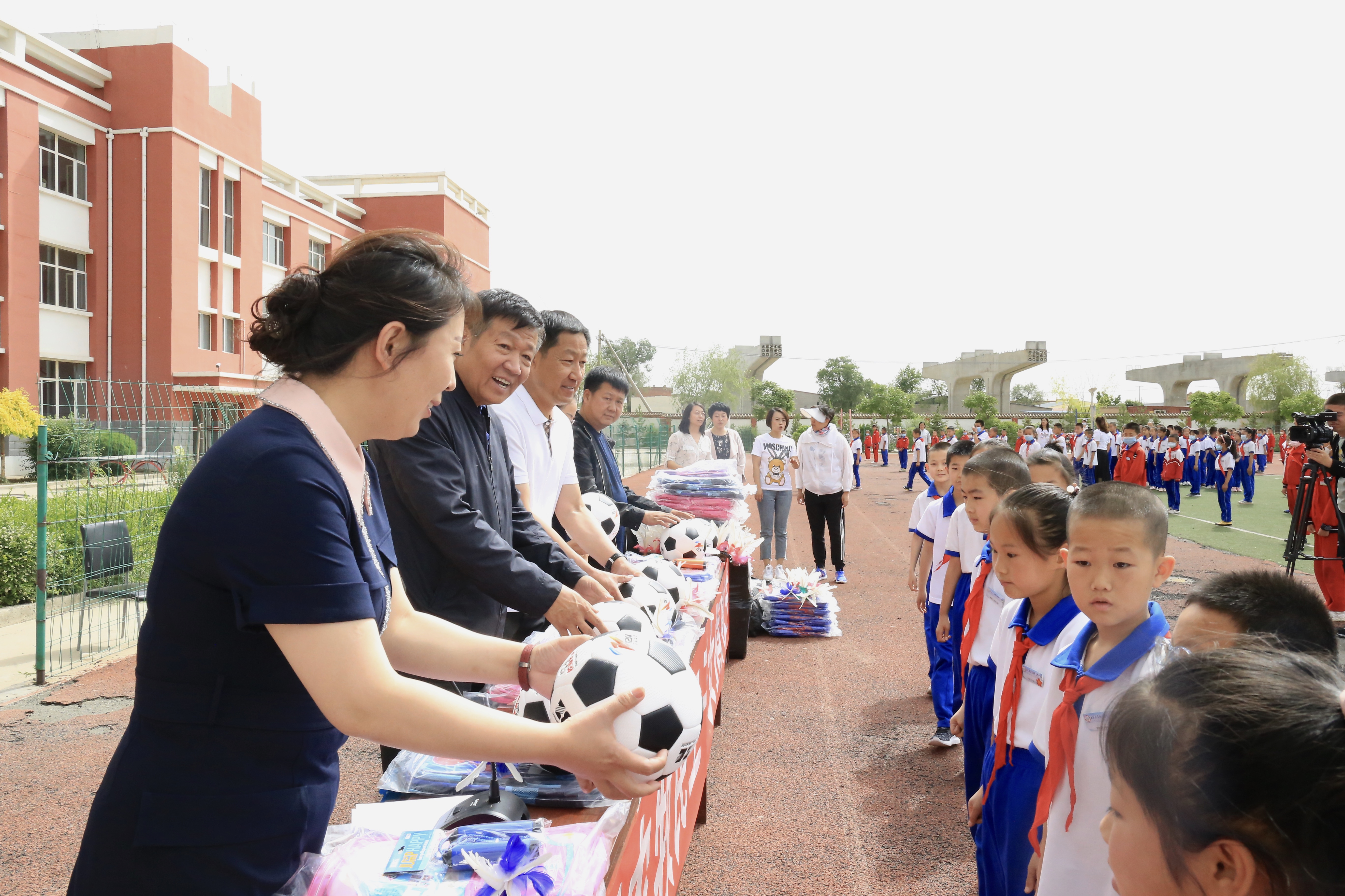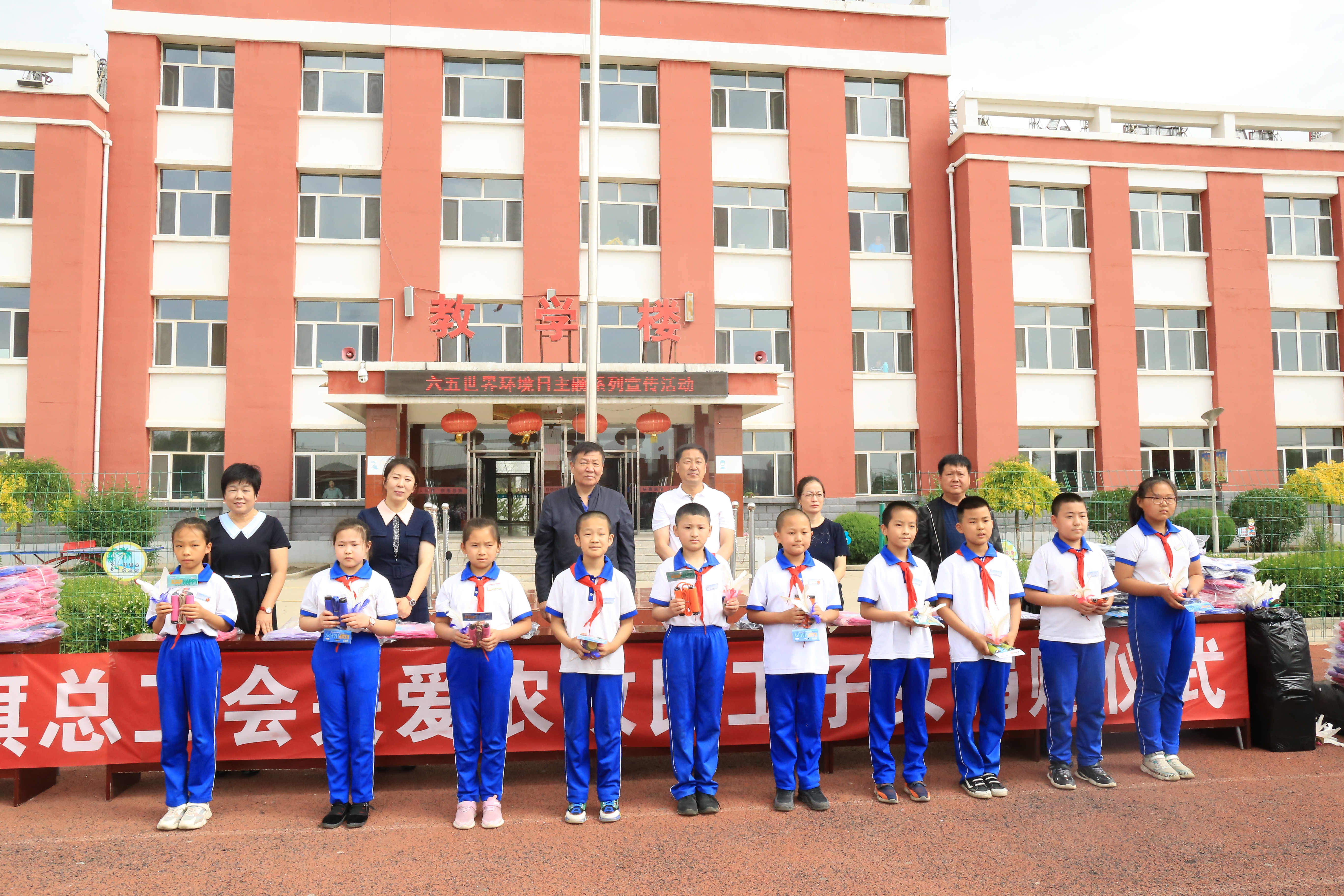 活动中,旗总工会为台阁牧中心校一至三年级学生发放了总价值1万元的书包240个、足球15颗、跳绳60根、毽子70个,用于日常学习和体育活动
