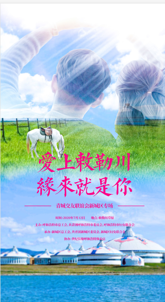 为充分发挥工青妇群团组织的桥梁纽带作用,进一步丰富单身青年的业余文化生活,拓宽沟通渠道,满足交流需求,由呼和浩特市总工会、团市委、市妇联主办,世纪佳缘呼和浩特体验店协办,新城区总工会、团委、妇联承办的2020年“爱上敕勒川 缘来就是你”——青城交友联谊会新城区专场将于7月12日在呼和浩特市敕勒川草原隆重举行。