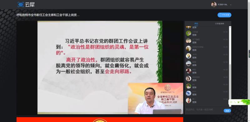 7月14日下午,呼和浩特市总工会第一期新任工会主席和工会干部上岗资格线上培训班正式开班,来自赛罕区140家机关、企事业单位工会的284名新任工会主席、工会干部参加了培训。市总工会党组成员、副主席冀罕钢出席了开班仪式。