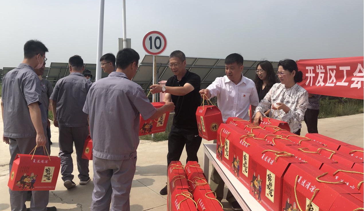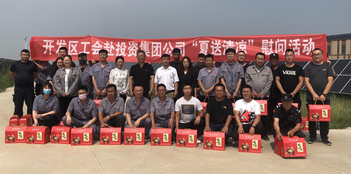 7月24日开发区机关工会刘浩波主席、白文晔副主席,在投资集团工会张冬梅主席的陪同下,来到投资集团下属子公司光伏电站,为投资集团总部以及下属子公司爱迩电子材料公司、光伏电站、嘉慧物业服务有限公司等54名坚守在户外一线的员工带去防暑降温慰问品。