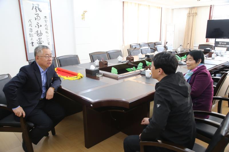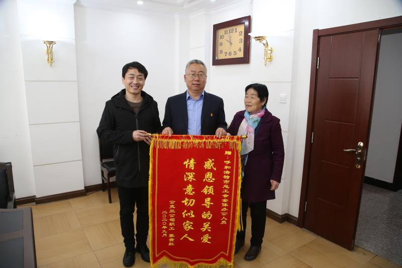 10月21日上午,呼和浩特市第三公共汽车公司困难职工张贵红在其母亲陪同下将一面印有“感恩领导的关爱,情深意切似家人”的锦旗送到市总工会办公室,市总工会党组书记、副主席汪俊亭代表市总工会接赠锦旗,张贵红对市总工会在关爱、帮扶困难职工中所做的工作表示感谢。