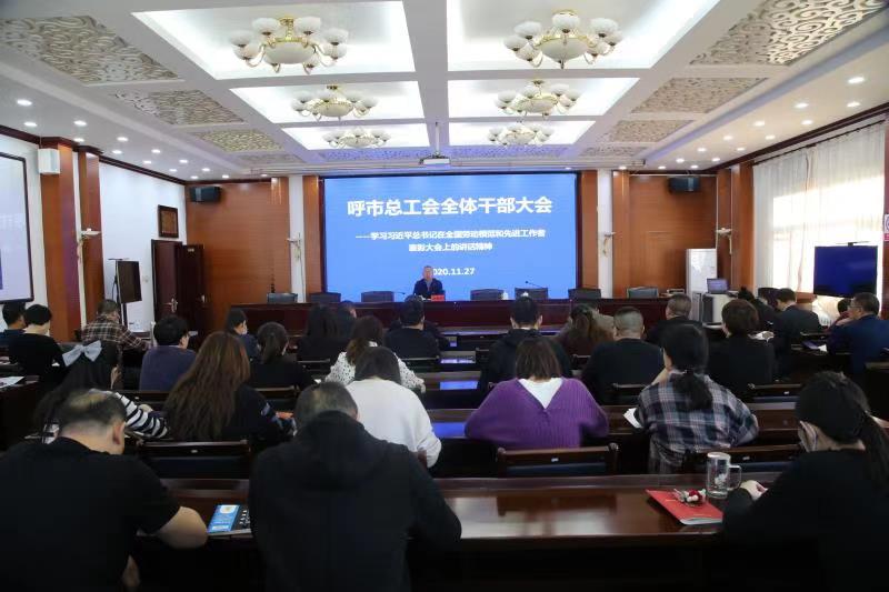 11月27日,呼和浩特市总工会召开全体干部职工大会,传达学习习近平总书记在全国劳动模范和先进工作者表彰大会上的讲话精神。会议由市总工会党组书记、副主席汪俊亭主持。