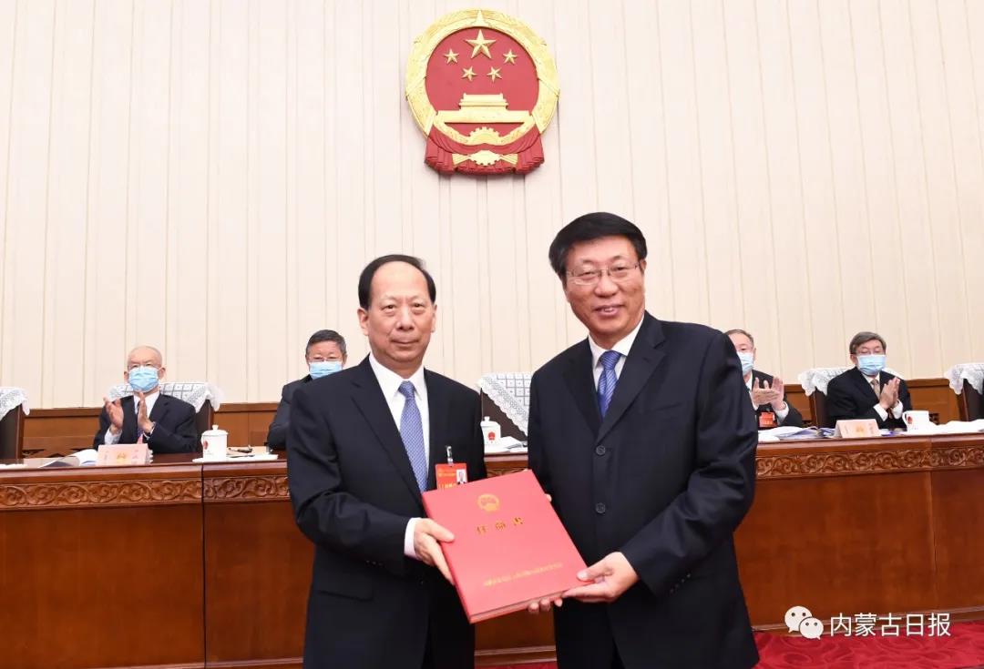 11月26日下午,自治区党委书记、人大常委会主任石泰峰,出席自治区十三届人大常委会第二十三次会议第三次全体会议,并为新任命的内蒙古自治区农牧厅厅长牧远颁发任命书。记者 袁永红 摄会议强调,要深入学习领会和贯彻落实党的十九届五中全会精神,认真谋划新发展阶段的人大工作,制定好自治区“十四五”规划纲要民主法治建设相关内容,做好自治区十三届人大四次会议审查批准我区“十四五”规划纲要工作,确保党的主张通过法定程序成为全区各族人民的共同意志。要深入学习贯彻习近平法治思想和中央全面依法治国工作会议精神,紧扣习近平总书记对推进全面依法治国提出的总体要求和重点工作,坚定坚决地贯彻落实好党中央关于全面依法治国的各项决策部署,确保党的路线方针政策在人大工作中得到全面贯彻落实。会议强调,各地各有关部门要认真宣传好、解读好本次会议通过的地方性法规,加强实施保障,推动法治理念深入人心。有关方面要认真执行自治区人大常委会作出的关于进一步加强未成年人检察工作的决定,综合运用多种手段,最大限度保障未成年人健康成长。全区各级人大要按照开展国有资产监督工作职责定位,进一步完善制度机制,提高监督质效,依法管好全区人民的共同财富。自治区人大常委会和代表建议承办部门要把办理代表建议同贯彻落实党中央决策部署紧密结合起来,切实将高质量建议转化为深化改革、推动发展的实际举措。各位组成人员和常委会各工作部门要认真做好年度收尾和总结工作,抓紧研究提出常委会明年立法、监督、决定、代表等工作项目建议,统筹安排好设区的市、旗县(市、区)和苏木(乡、镇)人大换届工作。要认真做好自治区十三届人大四次会议筹备工作,确保大会顺利召开、圆满成功。