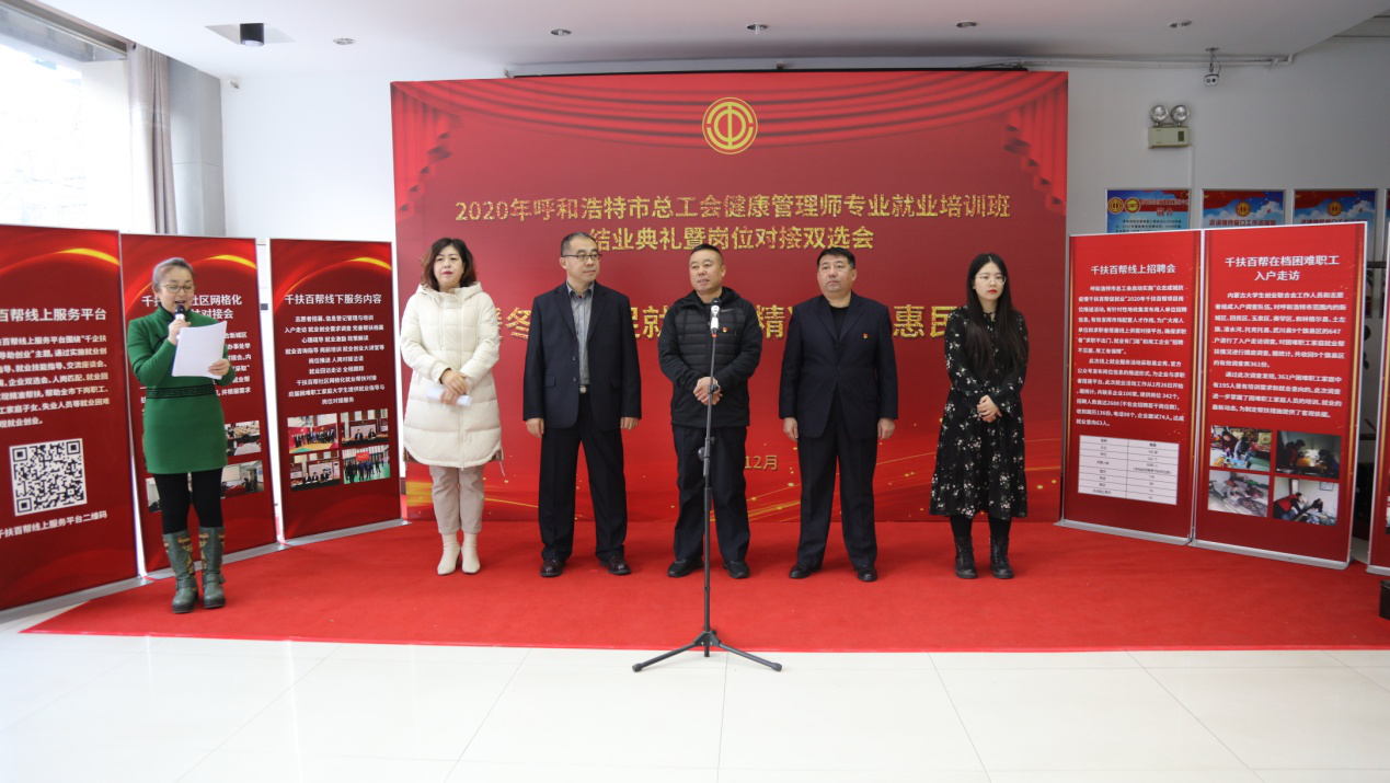 “暖冬送岗促就业,精准帮扶惠民生”。12月16日上午,呼和浩特市总工会成功举办了困难职工及就业困难群体健康管理师培训班结业典礼暨岗位对接双选会。呼市总工会保障部及职工服务中心负责人,儒科职业培训学校、内蒙古大学生创业联合会有关领导,70余名健康管理师专业培训班学员及20家招聘企业参加活动。
