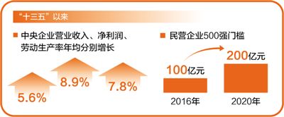 国企规模实力持续增强,效益稳步提高。预计到今年底,中央企业资产总额将接近69万亿元,比“十二五”末增长45%。“十三五”以来,中央企业营业收入、净利润、劳动生产率年均分别增长5.6%、8.9%、7.8%,进入世界500强的中央企业达到48家。民企改革发展成效显著。“十三五”以来,民营企业500强门槛从2016年的100亿元提升至2020年的200亿元;创新创业创造热情高涨,中小企业数量增长近1倍。