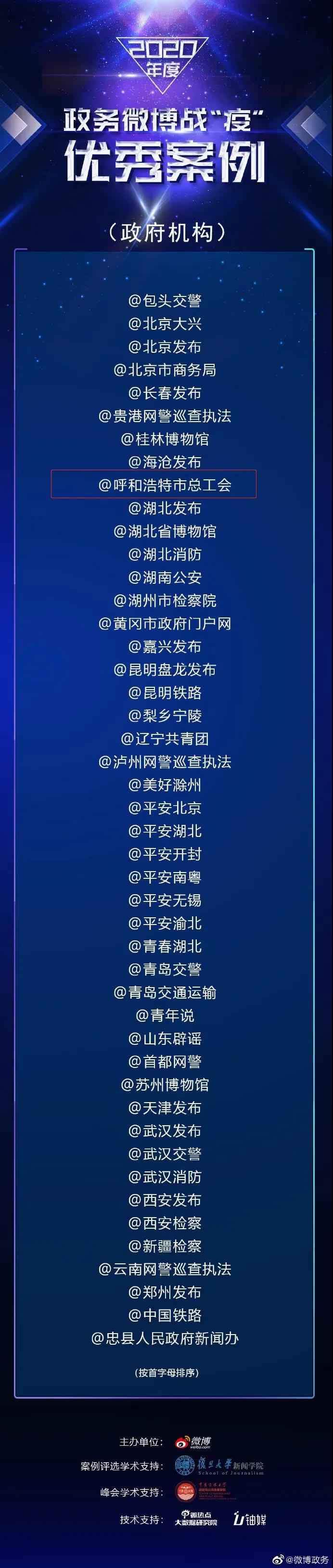 1月28日,由新浪微博举办的“2020年度政务微博优秀案例”正式公布,呼和浩特市总工会微博——@呼和浩特市总工会获选政府机构组“2020年度政务微博战‘疫’优秀案例”。