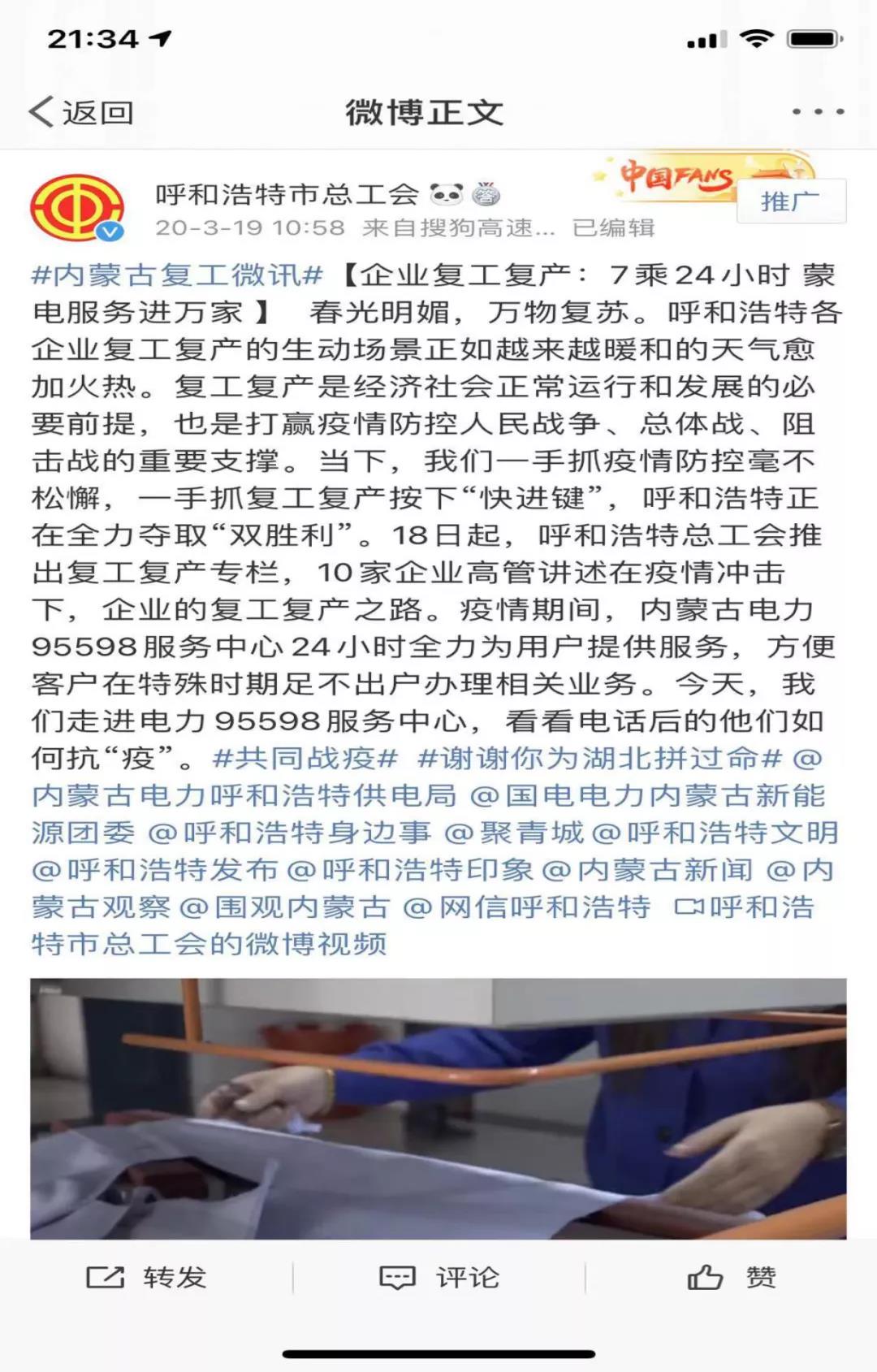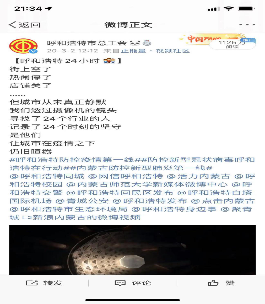 案例详情:2020年的春天,一场突如其来的疫情肆虐祖国大地。在这场特殊的“战疫”面前,千千万万奔赴前线的“逆行者”,他们有的是医生,有的是社区的志愿者,有的是执勤的交警……2月,呼和浩特整个城市对疫情还在严防严控中,呼和浩特市总工会用视频的镜头记录了24个行业,24个小时各时间段,呼和浩特市各行各业广大职工在疫情期间逆行而上的敬业精神。微博一经推出即好评如潮,引发呼和浩特各家媒体、政企单位官方微博、公众号争相转载,形成了良好的社会效应。最终该条视频阅量为1057万。3月中旬,内蒙古疫情形式趋好,各大企业积极筹备开始复工复产,呼和浩特市总工会同样用镜头记录了各企业积极复产工作状态,十期《复工复产》微博推出取得不同凡响的社会影响力,同时帮助疫情中受到影响的企业宣传推广,起到了良好的传播效果。战“疫”系列微博的推出增加了基层政务微博的活跃度,拓展了基层政务微博的用户,增强了基层政务微博的粘性。