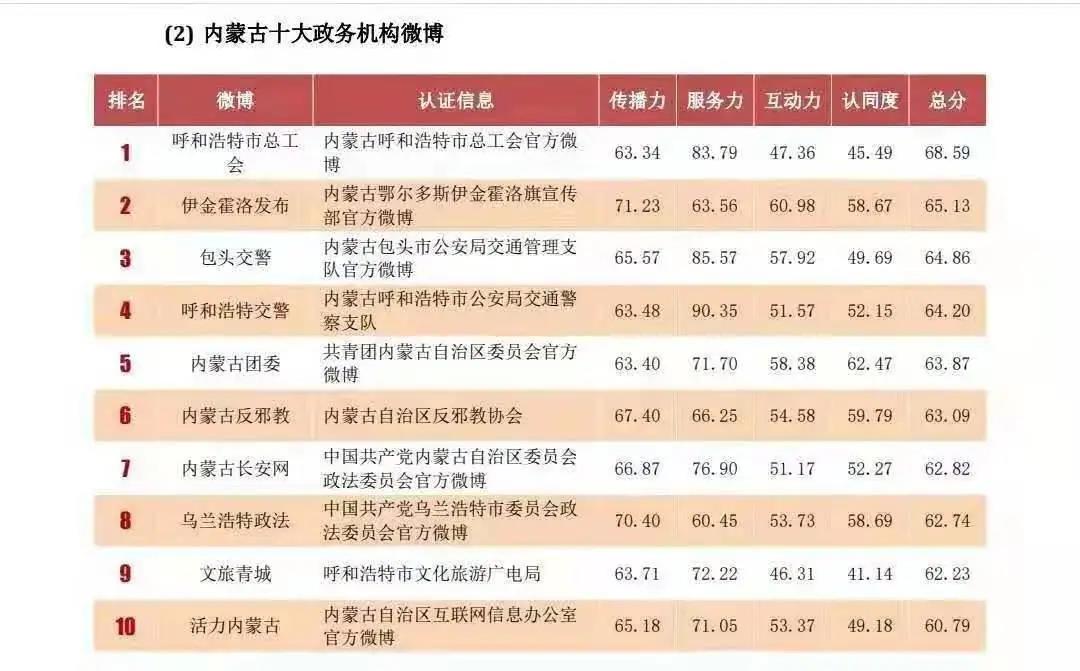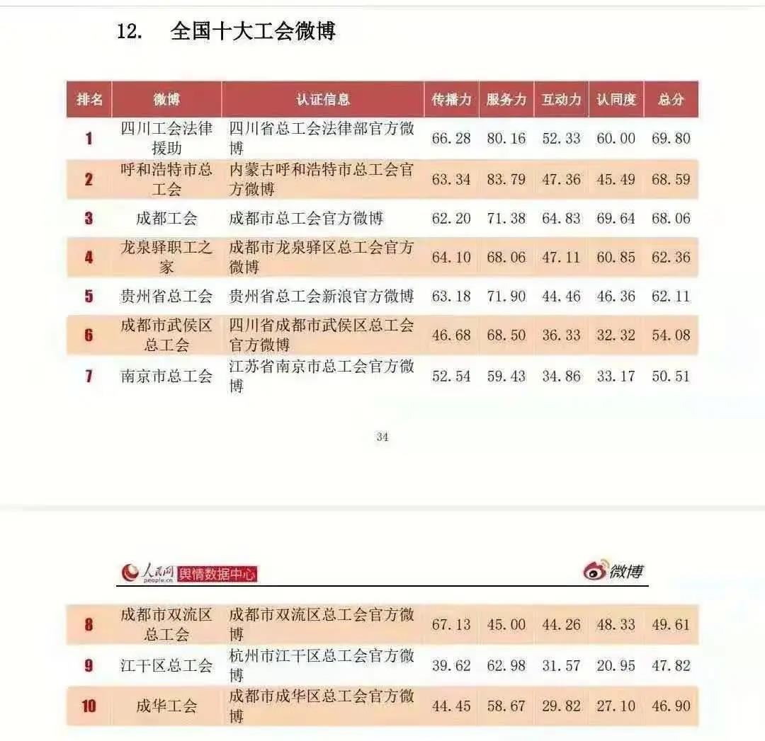 近日,人民网舆情数据中心携手新浪微博联合发布《2020 年政务微博影响力报告》,从微博的传播力、服务力、互动力和认同度评出“2020年度政务微博影响力排行榜”,@呼和浩特市总工会以传播力63.34,服务力83.79,互动力47.36,认同度45.49,总分68.59列全国工会排行榜第2名,内蒙古政务排行榜第1名。