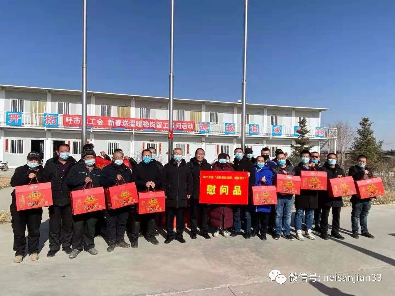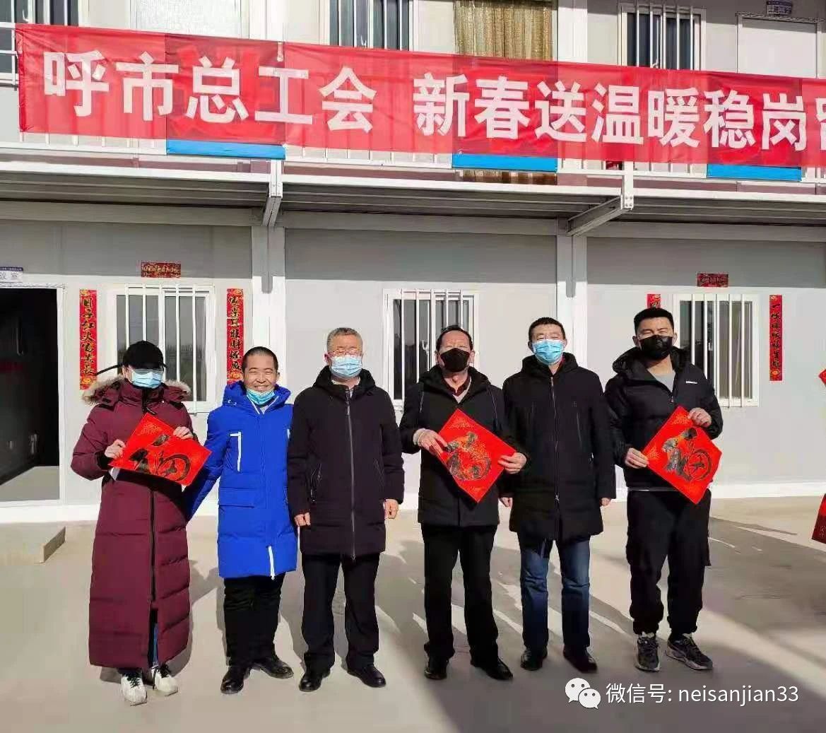 2月6日,呼和浩特市总工会深入内三建恒大文化旅游城一标段项目部开展春节慰问活动。在新春到来之际,将党和政府的关怀,带给留岗一线职工。参加此次活动的有呼市总工会党组书记、副主席汪俊亭,呼市建筑建材公路运输工会主席包苏和,呼市工会保障部部长王爱民等人。