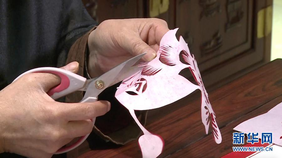 2月9日,“北京剪纸”非物质文化遗产传承人徐阳在书桌前剪纸,喜迎新春(视频截图)。新华社发