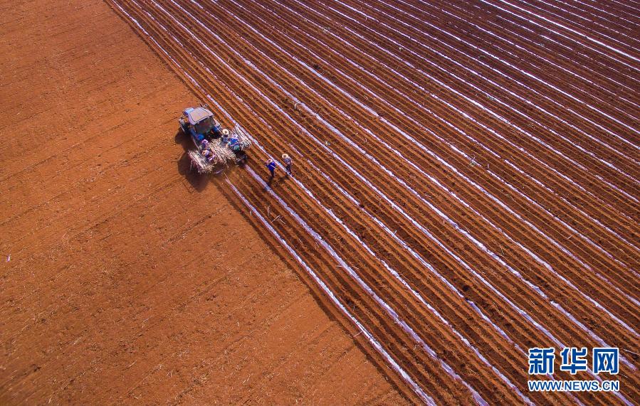 湛江市,甘蔗地里处处闪现着忙碌的身影,耕地、播种、施肥、覆膜、管护;