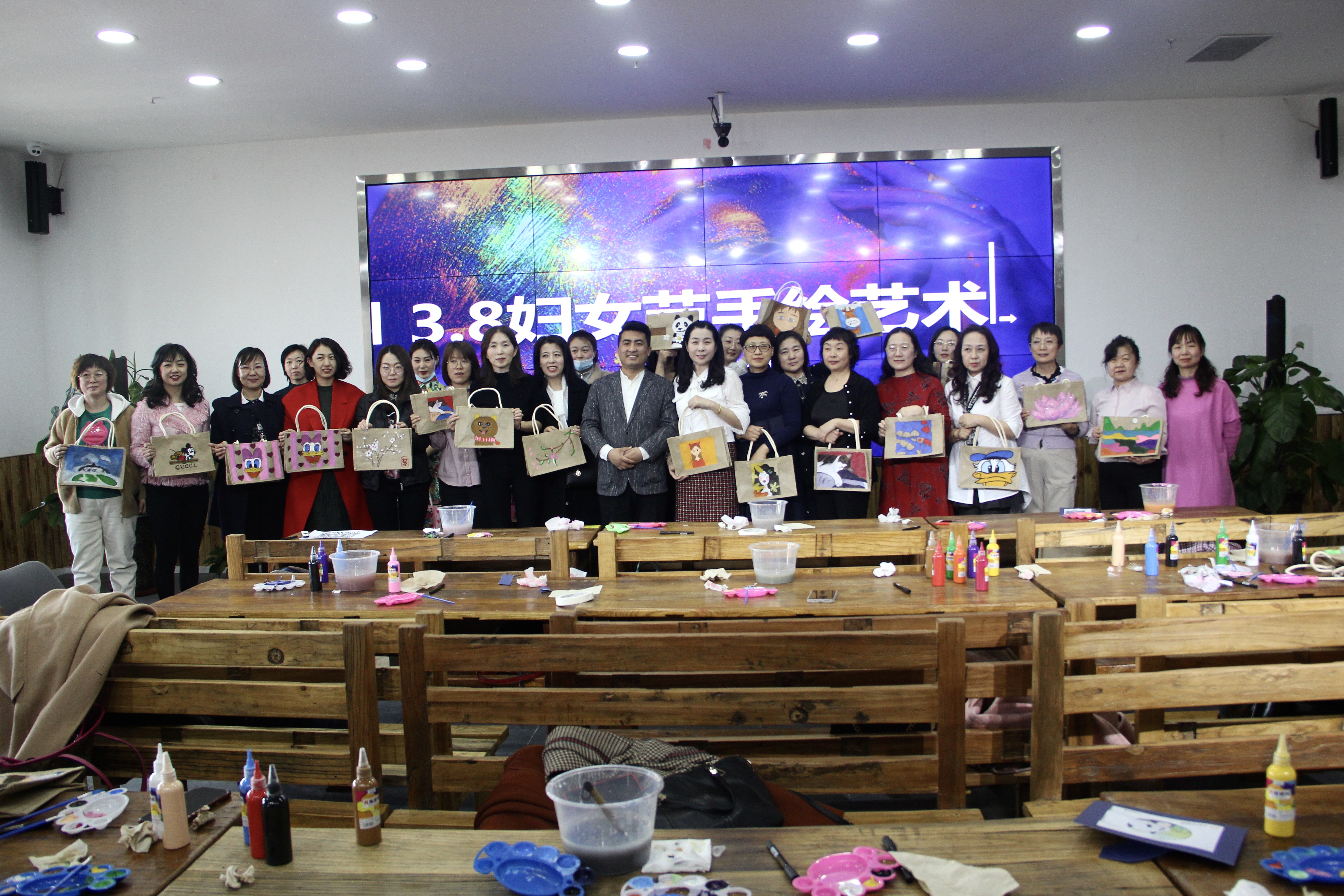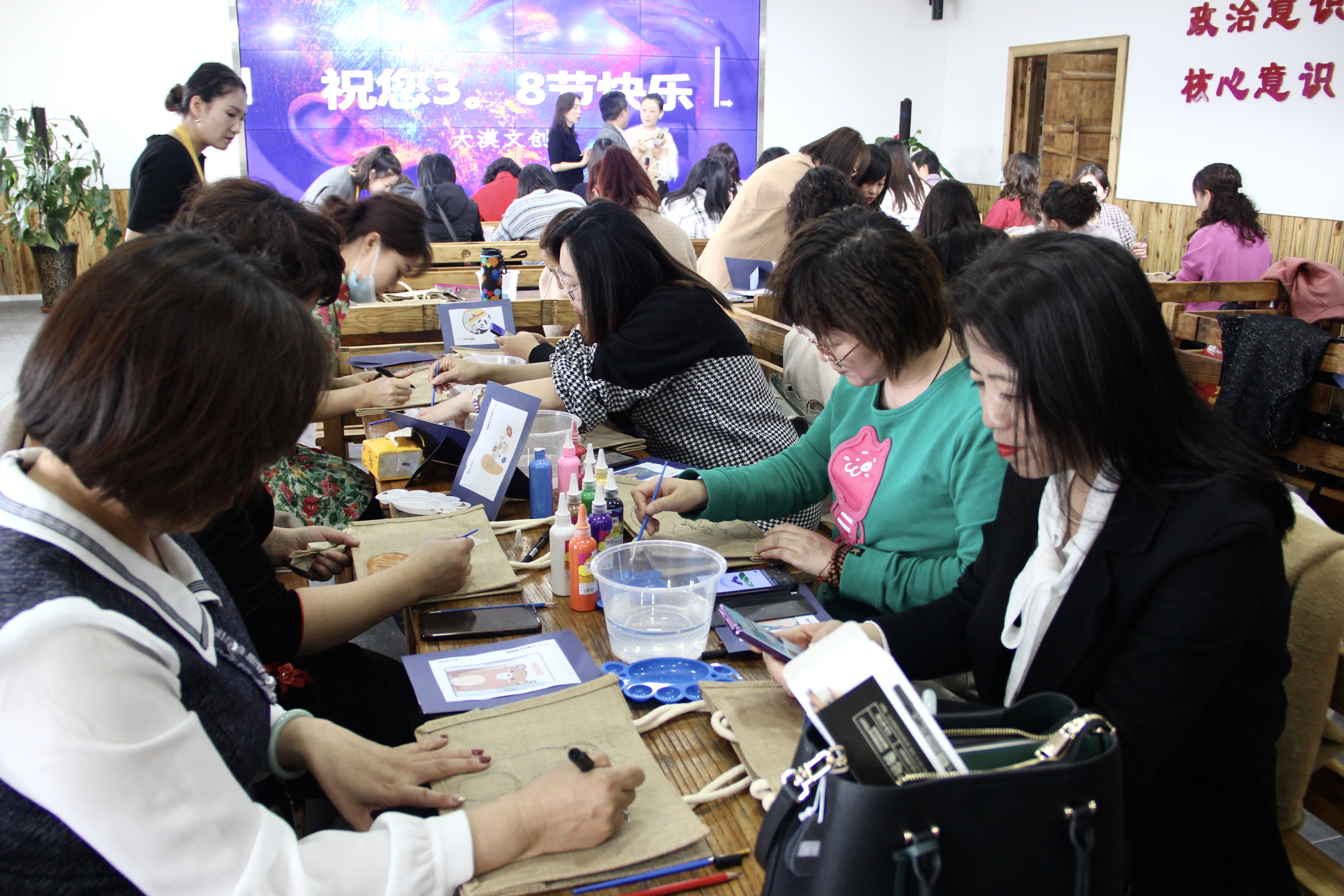 随后,大漠文创园的冀永军、康利两位老师为女职工现场讲授了手绘布包的艺术实践课程。在老师的带领下,大家认真构思、选图、构图,一笔一画间,呈现出了一件件细致精美、别出心裁的手绘作品,大家成就感油然而生。