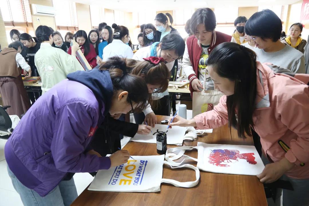 几位教授手工的老师已经把丝网印刷的模板、颜料和工具摆放好,员工有序排队体验了自制丝网印刷帆布袋的全部工艺。大家选择自己喜欢的图案和颜色,加上自己的手绘,纷纷做成了独一无二的专属手提袋。